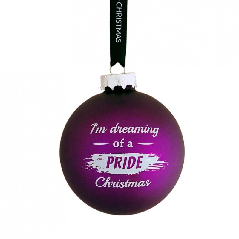 Décorez votre sapin de Noël avec la boule violette I'm dreaming of a Pride Christmas Toutes les boules de Noël sont fabriquées en verre et sont livrées dans des boîtes individuelles. Tous les textes sont en vinyle et ont été appliqués à la main. Diamètre : 7 cm