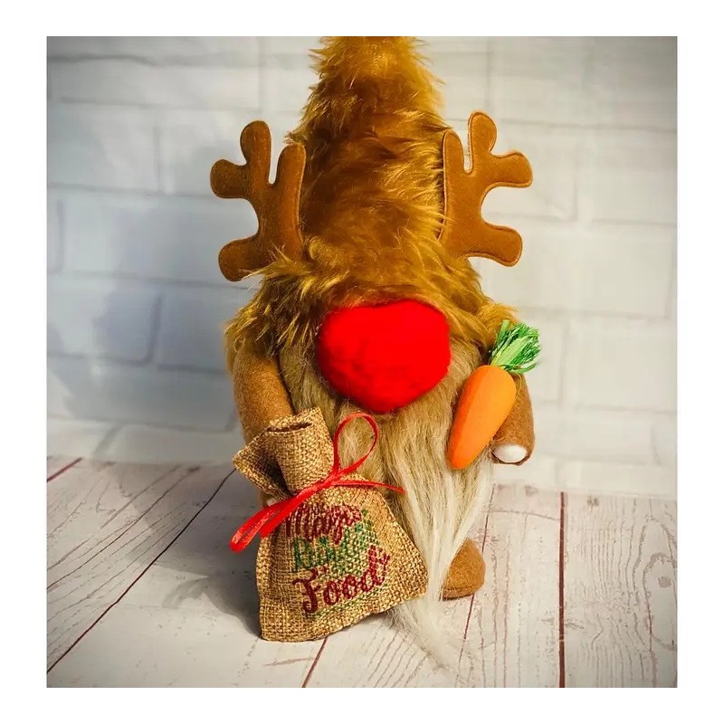 Le nain est vêtu d'un pull en feutre brun et d'un chapeau