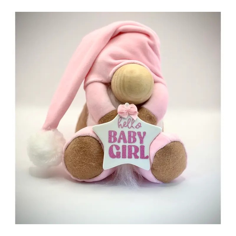 Le nain tient une étoile blanche en céramique avec l'inscription Hello Baby Girl.